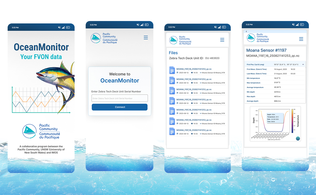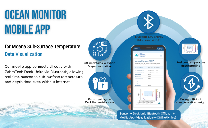 SysReforms International successfully designed and developed Ocean Monitor, an offline mobile application supporting the Moana Project of the Pacific Community (SPC), a regional initiative advancing climate monitoring and sustainable fisheries management across Pacific Island nations. The app enables fishers, scientists, and field teams to connect with ZebraTech’s Deck Units via Bluetooth Low Energy (BLE) to retrieve sub-surface temperature and depth data, decode it into readable formats, and visualize it through 2intuitive charts, all without requiring internet connectivity. Built with an offline-first architecture, the solution ensures data synchronization with SPC servers whenever connectivity becomes available. Designed for both iOS and Android, it is optimized for low-power maritime environments and simplified usability in field conditions. Key features include offline data collection and visualization, integration with BLE protocols, secure pairing through ZebraTech Deck Unit serial authentication, encrypted data transmission, interactive visualizations using Chart.js and D3.js, and automatic synchronization with SPC’s central servers. The solution empowers users to access and interpret oceanographic data in real time, enhances SPC’s capacity to gather accurate and accessible data for fisheries management and climate resilience, and strengthens the Fishing Vessel Ocean Observing Network (FVON) initiative by converting raw sensor data into actionable insights advancing data-driven ocean monitoring and bridging technology, sustainability, and climate science across the Pacific region.